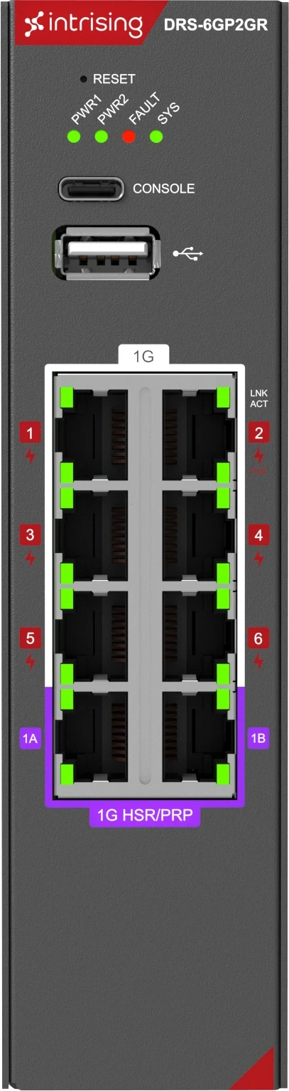 Intrising DRS Series comes with a variation of local ports and HSR/PRP ports.The DRS series utilizes the Intrising Operating System deliver a powerful combination of redundancy protocols and time synchronization.