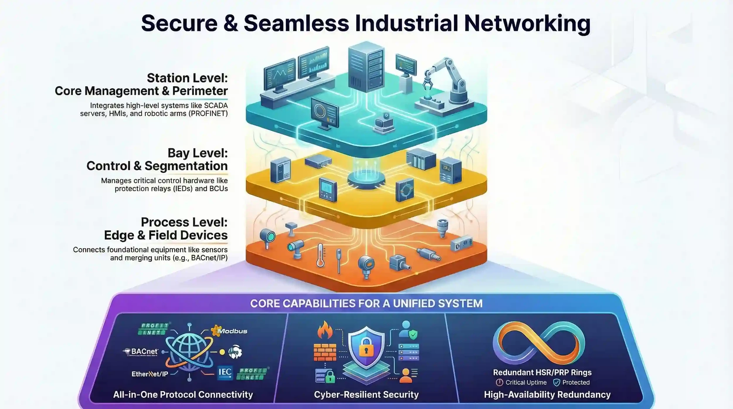 Security capabilities, including ACLs and IEC 62443 compliance, protect critical operational technology (OT) from cyber threats. Furthermore, protocol-aware switches simplify integration across heterogeneous devices, allowing seamless data exchange and interoperability between different automation systems. With enhanced monitoring and diagnostics, operators can proactively identify and resolve issues, optimize performance, and support Industry 4.0 initiatives, making industrial managed switches a cornerstone for efficient, resilient, and secure automated networks.