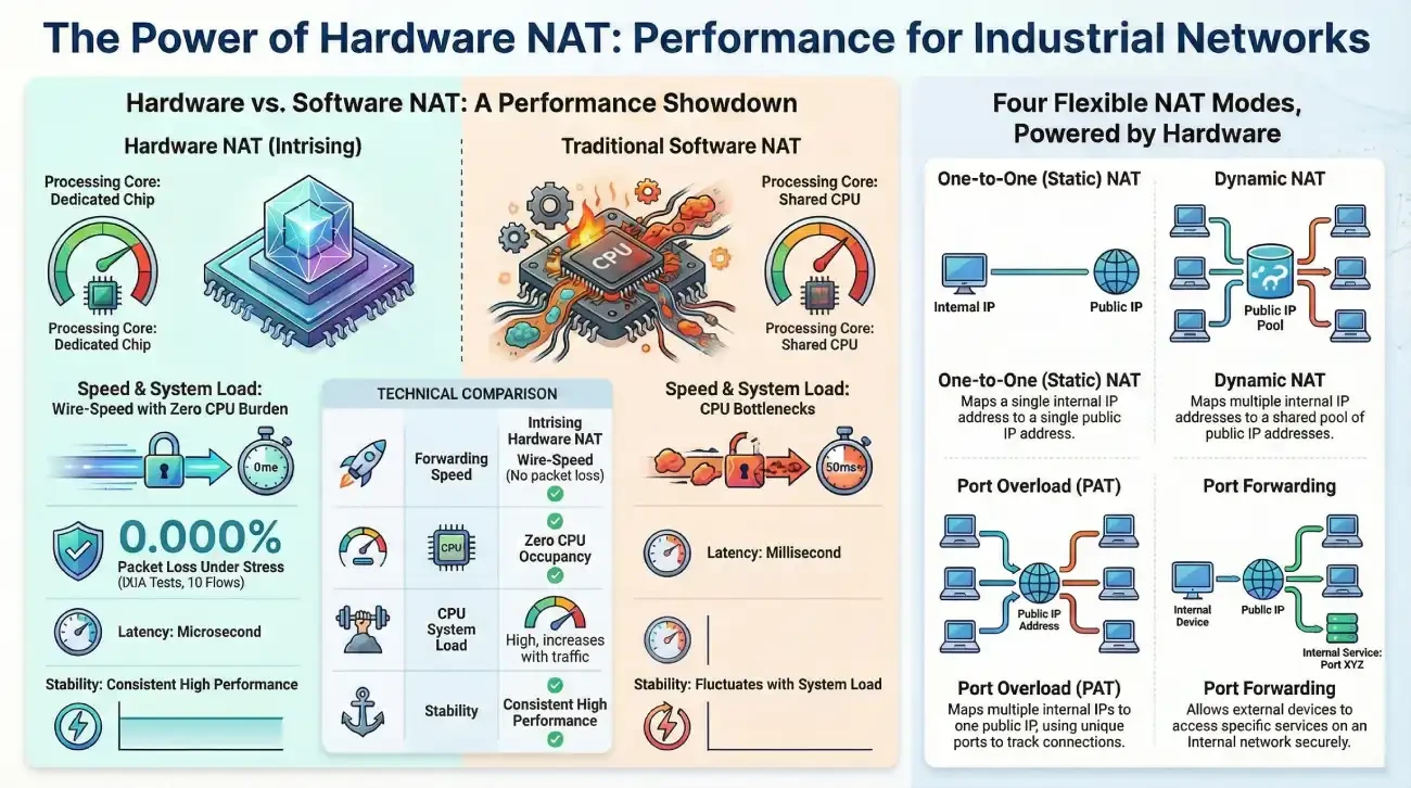 Modern industrial Ethernet switches such as Intrising B Series use advanced NAT features to resolve complex integration challenges. One-to-one (1:1) NAT is the primary solution for duplicate IP conflicts, mapping each internal machine IP to a unique external address, allowing identical skids to coexist on the same plant network. For broader connectivity, Dynamic NAT automatically assigns addresses from a pre-defined pool, ensuring temporary external access for various devices without manual configuration.