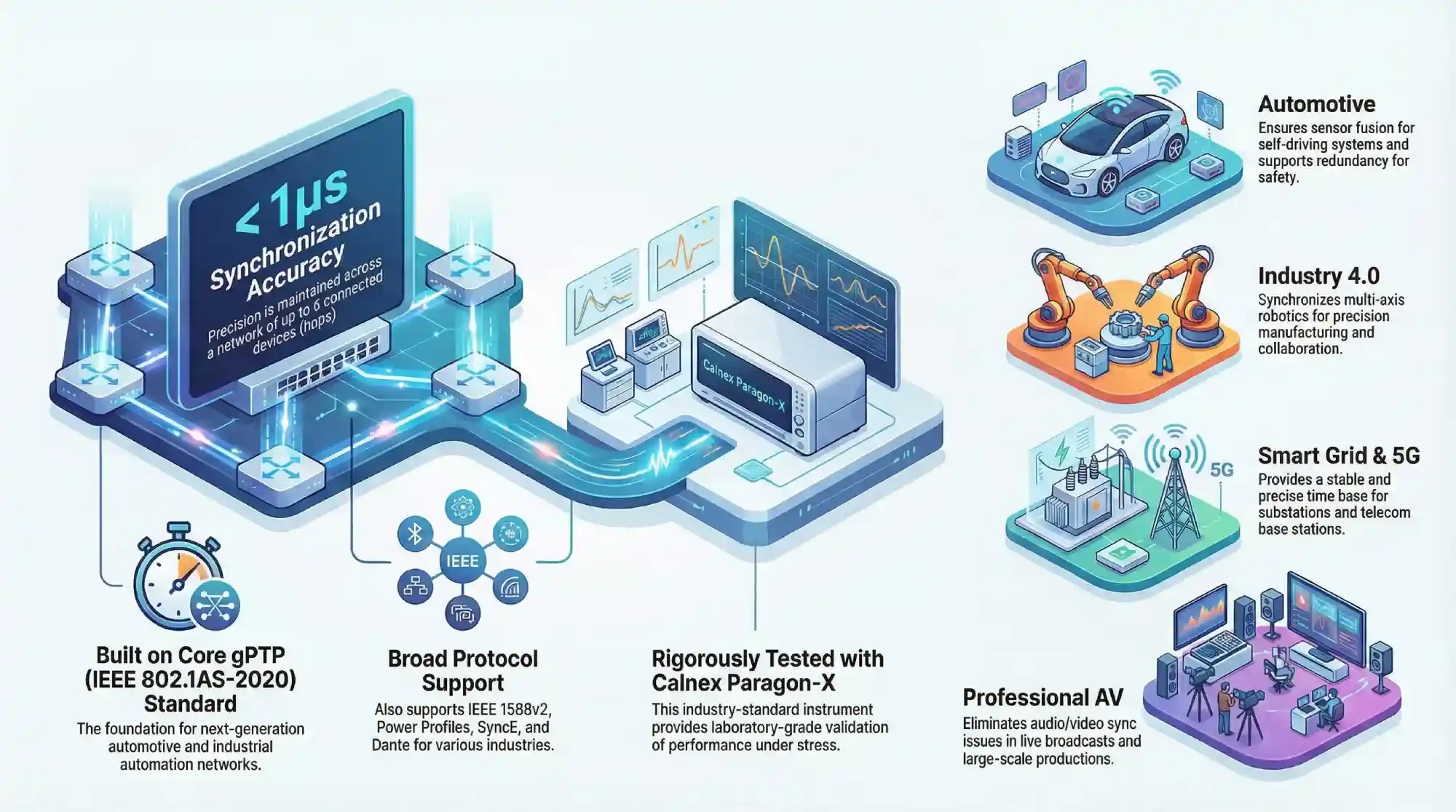 These technical capabilities translate into mission-critical benefits for multiple industries. In Automotive and Industry 4.0, it enables sensor fusion for self-driving safety and multi-axis robotics precision. Meanwhile, for Smart Grids, 5G, and Professional AV, it provides the stable time base required for substation synchronization, telecom base stations, and seamless audio/video alignment in large-scale live productions.