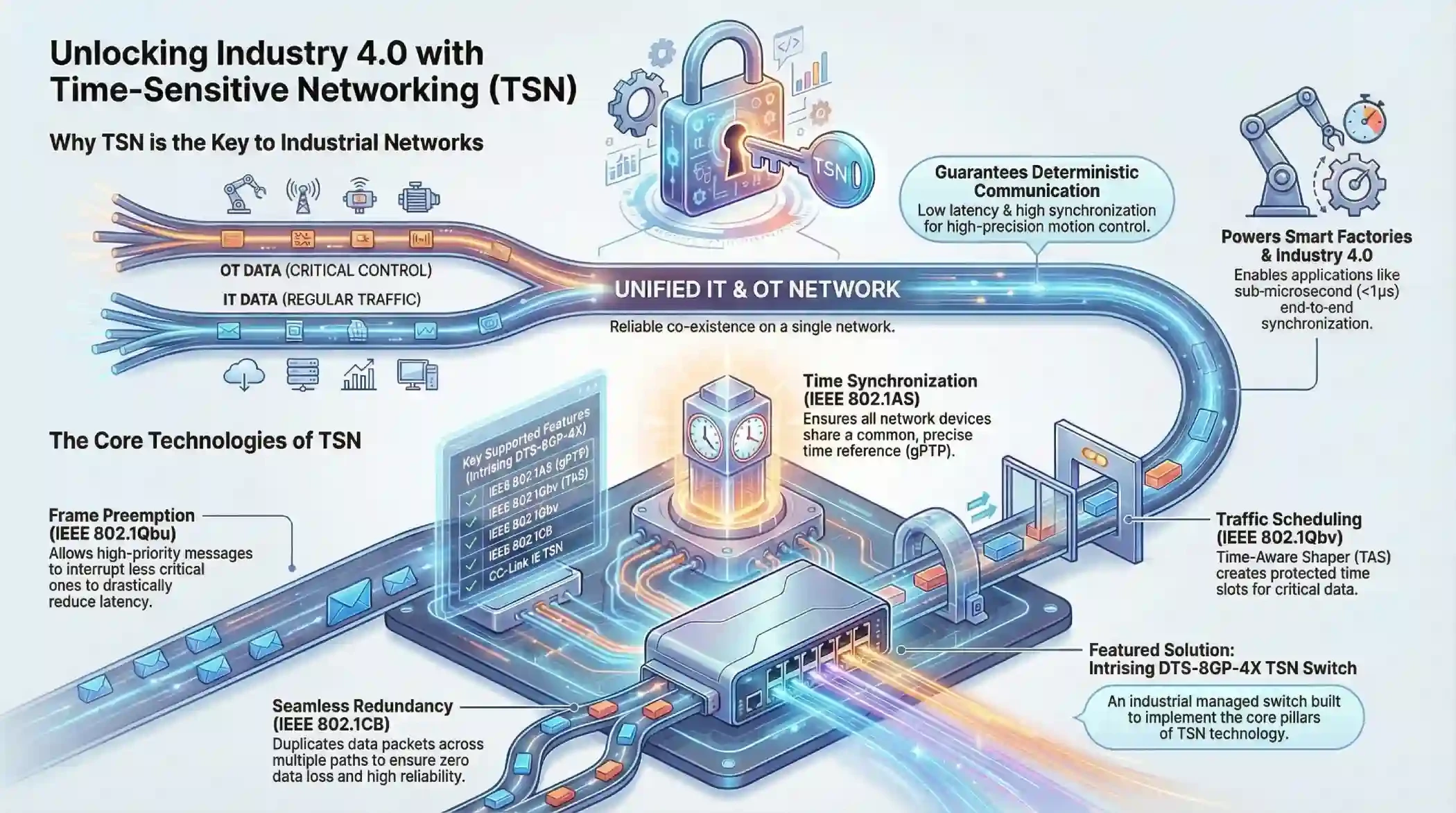 Furthermore, Frame Preemption (IEEE 802.1Qbu) allows urgent messages to interrupt less critical ones to reduce latency, while Seamless Redundancy (IEEE 802.1CB) duplicates packets across multiple paths to ensure zero data loss. By integrating these features into Intrising DTS-8GP-4X TSN Switch, industries achieve deterministic, high-precision motion control. This eliminates the cost and complexity of proprietary, isolated legacy systems, allowing for a truly scalable, interoperable, and future-proof industrial automation environment that supports real-time communication and high-bandwidth data analytics simultaneously across the entire factory floor.